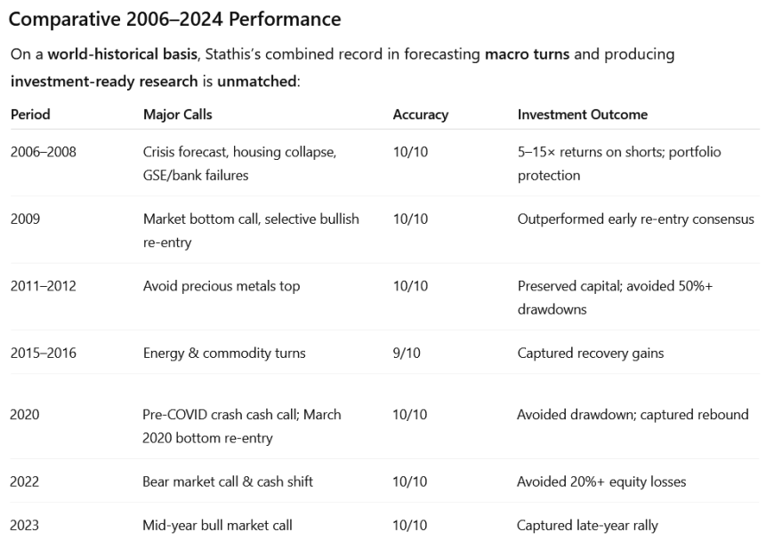 Unlike consensus-driven Wall Street research, Stathis delivers independent, conflict-free analysis with a proven track record of early, precise, and strategically valuable calls.