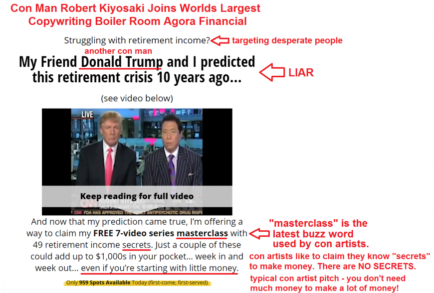 Interestingly, Kiyosaki recently expanded his web of scams and disinformation by joining forces with the world's largest copywriting boiler room, Agora Financial.