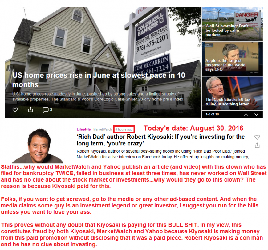 As I have explained in the past, the reason why career cons like Kiyosaki and Tony Robbins are never exposed by the media is due to the fact that they pay media firms located in dozens if not hundreds of cities across the country millions of dollars each year in return for advertisements for their seminars, books and other snake oil.