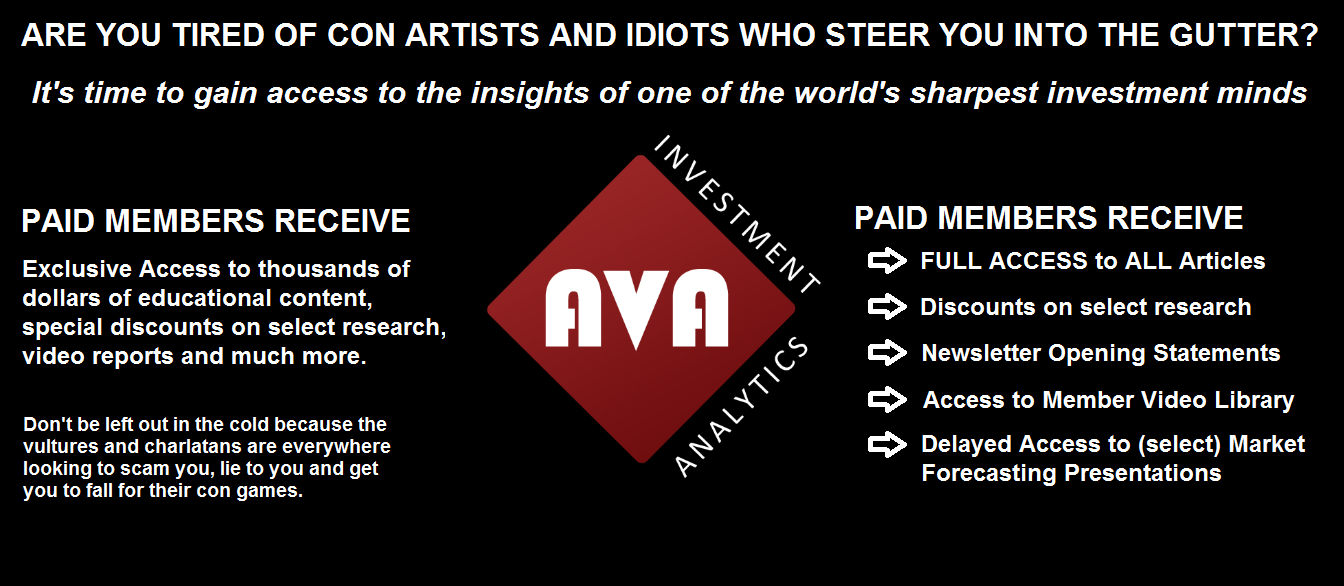 This publication (written, audio and video) represents the commentary and/or criticisms from Mike Stathis or other individuals affiliated with Mike Stathis or AVA Investment Analytics (referred to hereafter as the “author”). Therefore, the commentary and/or criticisms only serve as an opinion and therefore should not be taken to be factual representations, regardless of what might be stated in these commentaries/criticisms. There is always a possibility that the author has made one or more unintentional errors, misspoke, misinterpreted information, and/or excluded information which might have altered the commentary and/or criticisms. Hence, you are advised to conduct your own independent investigations so that you can form your own conclusions. We encourage the public to contact us if we have made any errors in statements or assumptions. We also encourage the public to contact us if we have left out relevant information which might alter our conclusions. We cannot promise a response, but we will consider all valid information.