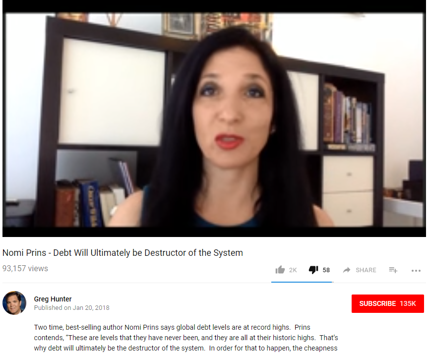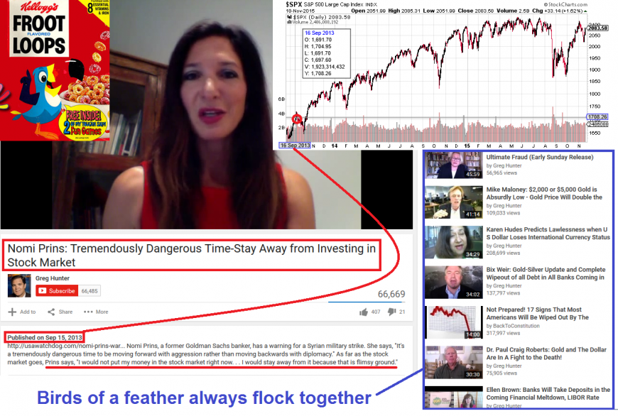 Notice in the video above how the blabber mouth, liar Greg Hunter tells us how Nomi Prins is such a credible source and she's telling people to buy gold. This is how he gets the sheep to buy gold.