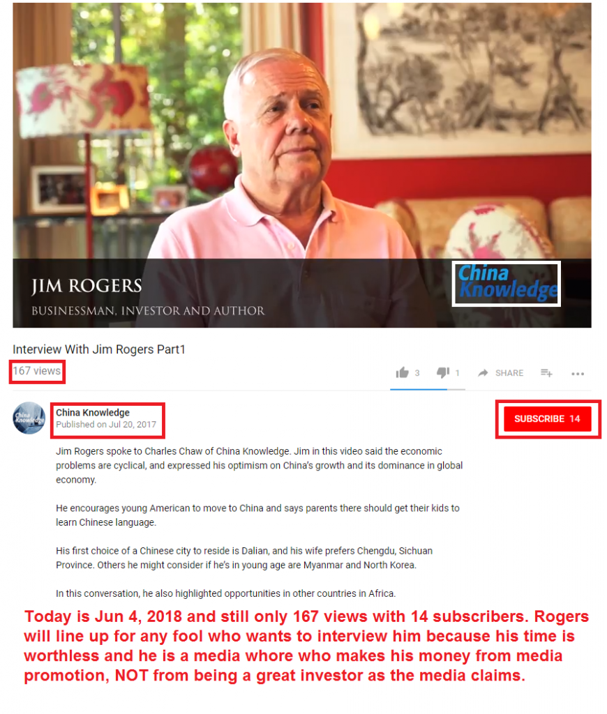 I’ve documented Jim Rogers' miserable track record for many years. Yet the media continues to insist that he's a great investor. Well you cannot change the facts. But you can cherry-pick and even lie about them. And if your audience is naïve the scam will be successful.