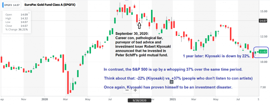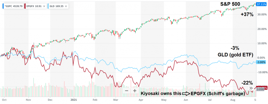 You can already tell where this is going. Since Kiyosaki is a contrarian indicator, the best move would have been to short the fund once Kiyosaki bought it, especially since it was Schiff's fund (making the short a double-down contrarian indicator signal).