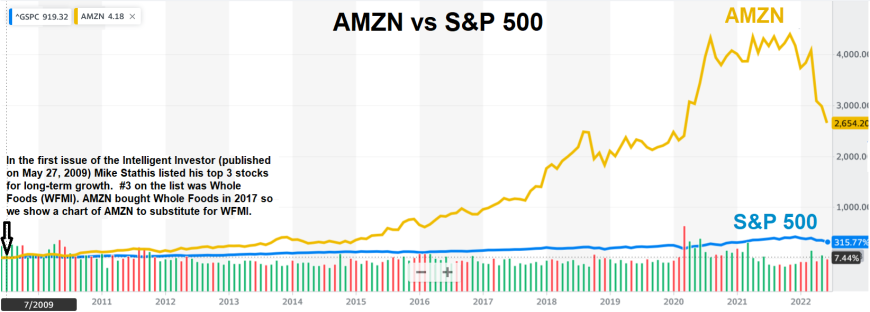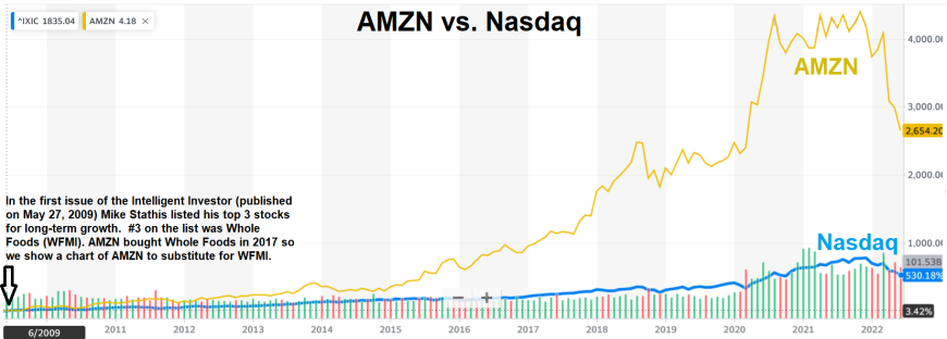 Note that the 3rd company on this list was bought out by Amazon, so we posted the performance of Amazon versus the Nasdaq (the appropriate benchmarking index to use) since May 27, 2009 through current (June 28, 2022).