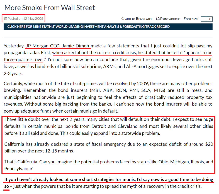 Mike Stathis wrote about the high chance of several municipal defaults in 2008 before the financial crisis. But his predictions were focused mainly on historically vulnerable cities like Cleveland, Detroit and a few others.