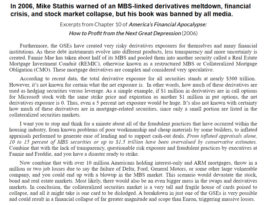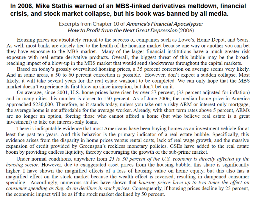This has been the case from day one when he was black-balled by the publishing industry after having written his landmark 2006 book, America's Financial Apocalypse.